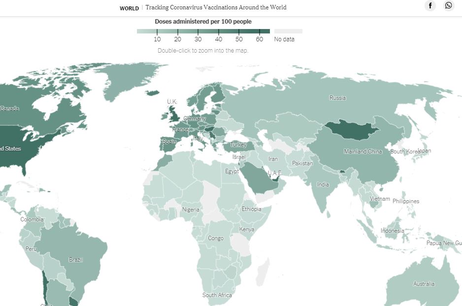 Улс орнуудад вакцинжуулалтад хамрагдалт эрс ялгаатай байгааг мэдээлэлд онцолсон байна. “The New York Times” уг мэдээллийг Оксфордын Их Сургуулийн “Our World in Data"  судалгаанд  үндэслэн боловсруулжээ.