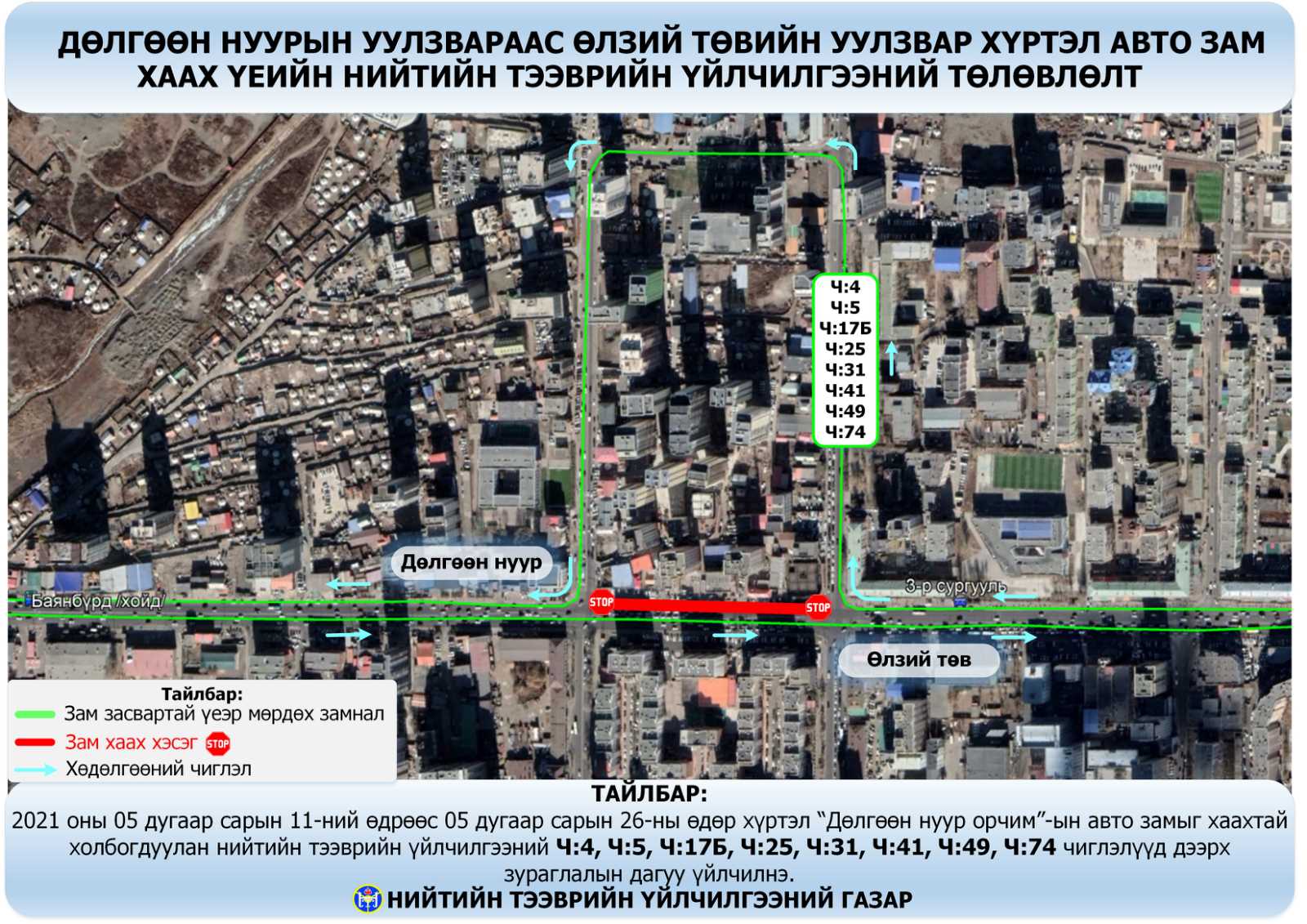 "Дөлгөөн нуур"-ын уулзвараас "Өлзий" төвийн уулзвар хүртэлх авто замыг тавдугаар сарын 11-26-ныг хүртэл хааж, шугам засварын ажлыг хийх болсонтой холбогдуулан нийтийн тээврийн есөн чиглэлд өөрчлөлт орж байна.