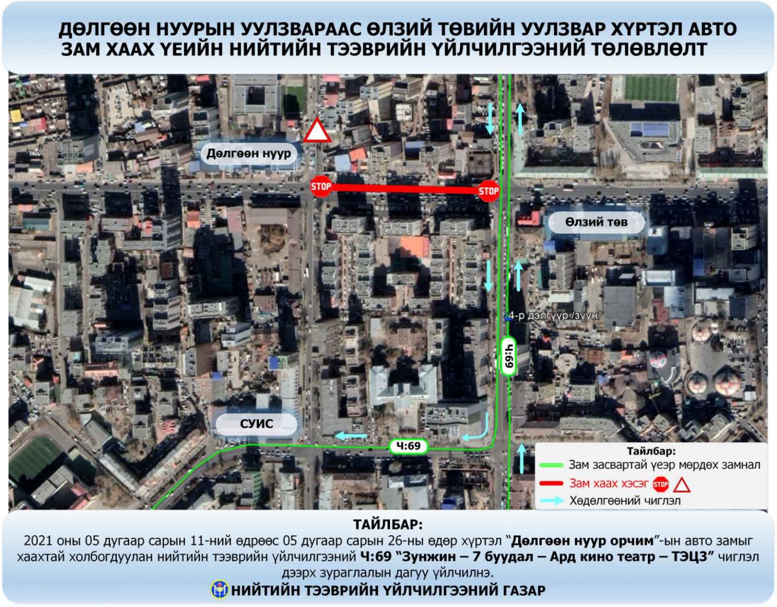 Ч:69 “Зунжин 7 буудал- Ард кино театр-ТЭЦ-3” чиглэл доорх зураглалын дагуу хөдөлгөөнд оролцоно.