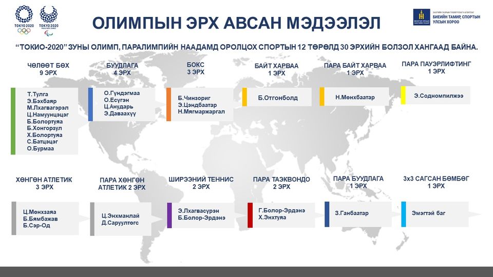 Токио хотноо 2021.07.23-08.08-ны өдрүүдэд зуны XXXII олимпын наадам, 2021.08.24-09.05-ны өдрүүдэд зуны XVI паралимпын наадам зохион байгуулагдана. Монгол улсын үндэсний шигшээ багийн тамирчид 2020.05.12-ны өдрийн байдлаар 30 эрхийн болзол хангаад байна. Хамгийн сүүлд эрх авсан тамирчдыг онцолбол: