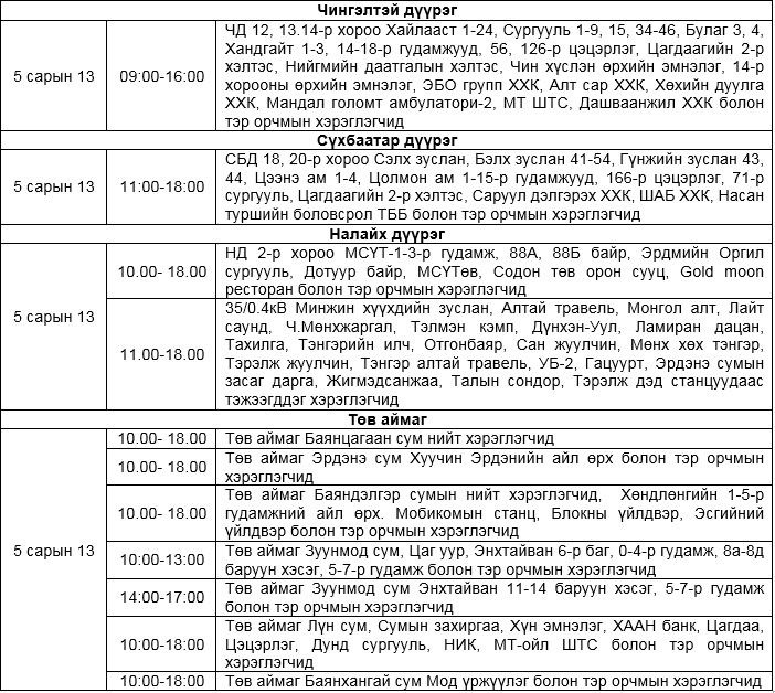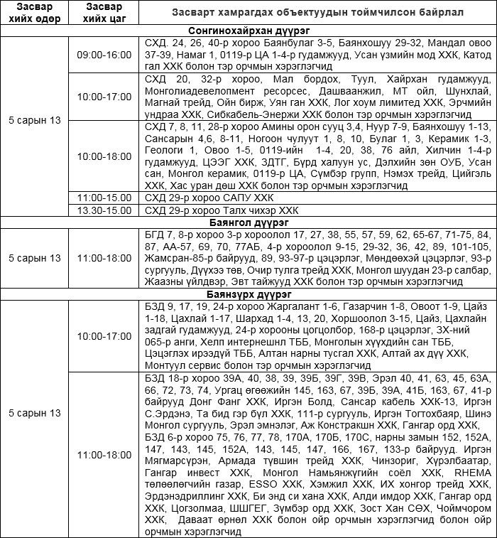 Жич: Засварын ажлыг тухайн тоноглолыг хүчдэлээс бүрэн чөлөөлсний дараа хийдэг нөхцөл байдлыг харгалзан үзэж, хүлээцтэй хандахыг хэрэглэгч та бүхнээс хүсье. Мөн тодорхой шалтгааны улмаас засварын хуваарьт өөрчлөлт орох тохиолдолд хангагч байгууллагаас зарыг дахин хүргэнэ.