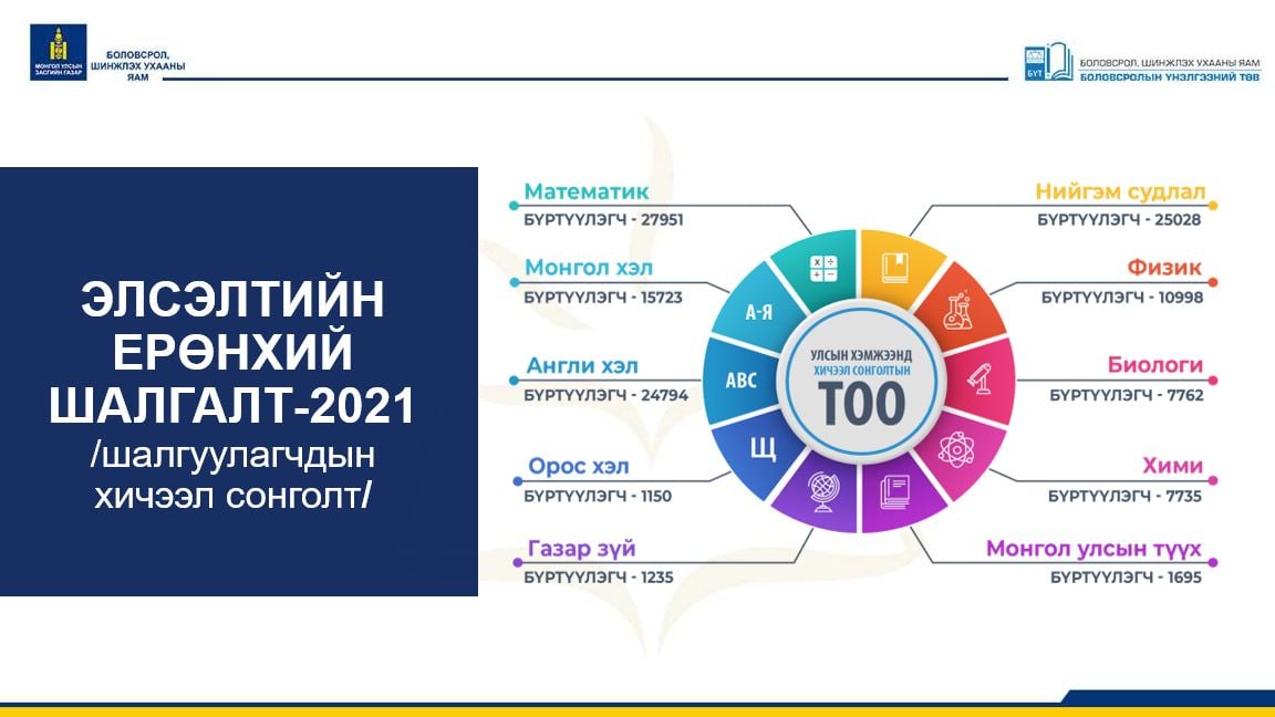 2021 оны элсэлтийн ерөнхий шалгалтыг долоодугаар сарын 1-4-ний өдрүүдэд зохион байгуулна.