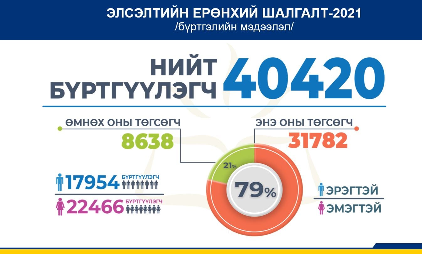 Элсэлтийн Ерөнхий шалгалтын бүртгэл 5 дугаар сарын 05-ны өдөр хүртэл үргэлжилж 40420 суралцагч шалгалтад бүртгүүлсэн байна. Энэ хичээлийн жилд 12 дугаар ангийг 34811 сурагч төгсөж байгаагаас 31782 нь ЭЕШ-д хамрагдахаар бүртгүүлжээ. Харин өмнөх оны төгсөгчдөөс 8638 сурагч ЭЕШ-д хамрагдах хүсэлт гаргаад байна. Бүртгүүлсэн сурагчдын 44 хувь нь эрэгтэй, 56 хувь нь эмэгтэй байна. ЭЕШ-д газарзүйн хичээл сонгосон 1235 сурагч байгаа нь хамгийн цөөн үзүүлэлт бол, 27951 сурагч математикийн хичээлийг сонгосон нь хамгийн их үзүүлэлт болж байна.