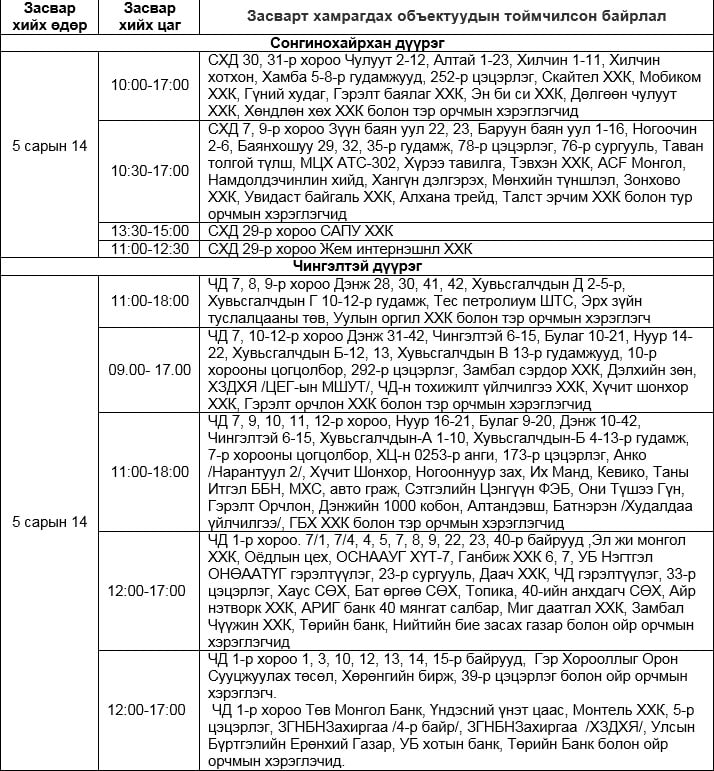 Тодорхой шалтгааны улмаас засварын хуваарьт өөрчлөлт орох тохиолдолд хангагч байгууллагаас зарыг дахин хүргэнэ.