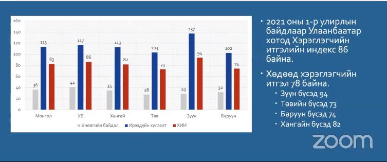 Сүүлийн судалгаанаас харахад, 2020 оны сүүлийн улирлын индексийг  хэвийн он болох 2018 оны үзүүлэлттэй харьцуулахад гарч байсан үзүүлэлтээс 2021 оны эхний улирлыг хэвийн онтой харьцуулахад гарсан өөрчлөлт эерэг буюу 14 пунктээр өссөн үзүүлэлттэй байна.