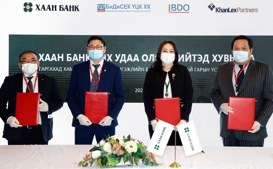 ХААН Банкны хувьцааг олон нийтэд танилцуулж, Хөрөнгийн бирж дээр анх удаа арилжаалах үйл ажиллагаанд “БиДиСек” ХК нь үндсэн андеррайтераар, “ХаанЛекс Партнерс” ХХН нь хууль зүйн зөвлөхөөр, “БДО аудит” ХХК нь бизнесийн үнэлгээний чиглэлээр хамтран ажиллахаар боллоо. Банкны зүгээс холбогдох хууль журмын дагуу Санхүүгийн зохицуулах хорооноос тусгай зөвшөөрөл авсан компаниудын дунд сонгон шалгаруулалт явуулж, эдгээр компанийг тодруулсан бөгөөд салбартаа тэргүүлэгч, нэр хүндтэй мэргэжлийн байгууллагууд гэдгээрээ онцлог юм.