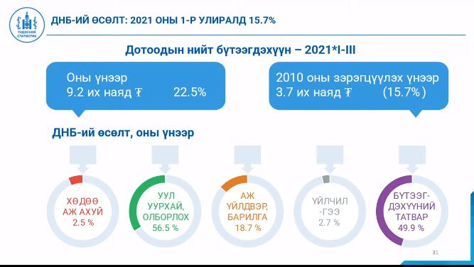Үндэсний тооцоо шинжилгээ судалгааны газрын дарга А.Дэмбэрэл “Дотоодын нийт бүтээгдэхүүн (үйлдвэрлэлийн аргаар тооцсон) 2021 оны нэгдүгээр улиралд урьдчилсан гүйцэтгэлээр оны үнээр 9.2 их наяд төгрөг болж, өмнөх оны мөн үеэс 22.5 хувиар өслөө. 2010 оны зэрэгцүүлэх үнээр 3.7 их наяд төгрөг болж, 15.7 хувиар өслөө” гэв.
