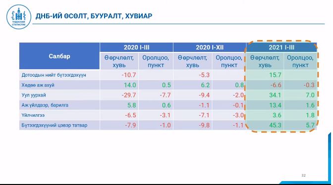 Тэгвэл 2020 оны эхний улиралд 10.7 хувийн уналттай гарч байсан Монголын эдийн засаг 2021 оны эхний улиралд 15.7 хувийн өсөлттэй гарлаа. 15.7 хувийн өсөлтийн бүтцийг харвал: