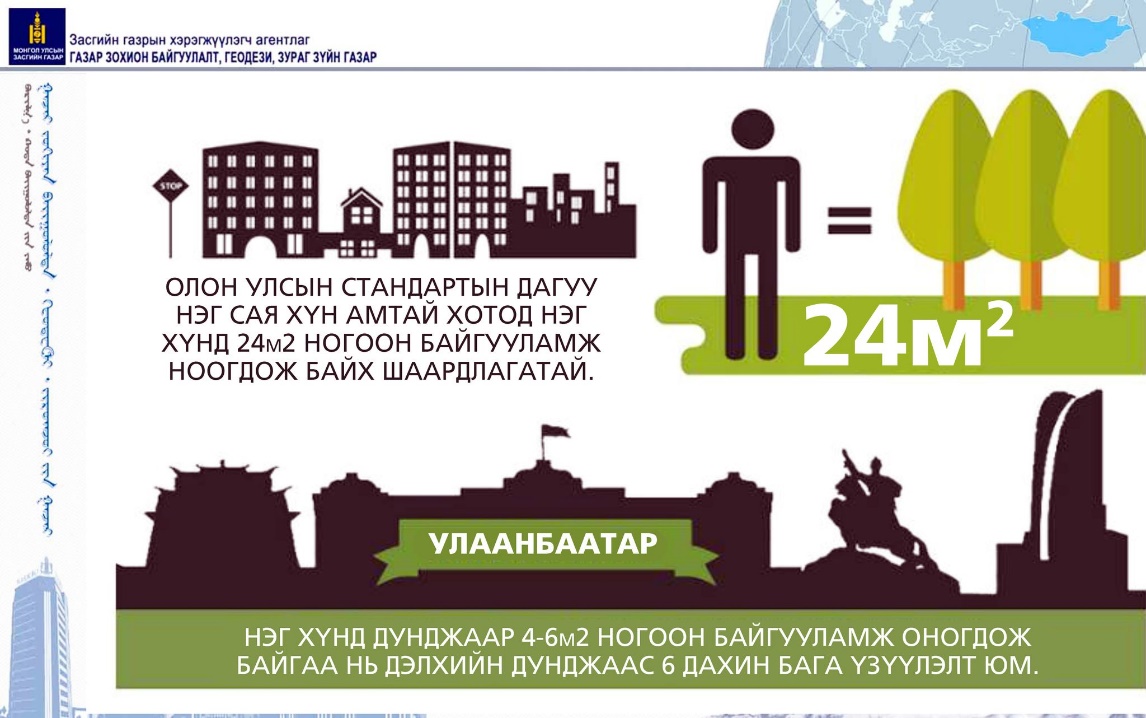 Олон улсын стандартын дагуу нэг сая хүн амтай хотод нэг хүнд 24 м.кв ногоон байгууламж ноогдож байх шаардлагатай хэмээн үздэг. Улаанбаатар хотын хувьд энэ тоо 6 дахин бага буюу 1 хүнд 4 м.кв оногдож байгаа нь Улаанбаатарчуудын тулгамдсан асуудал болж байна.