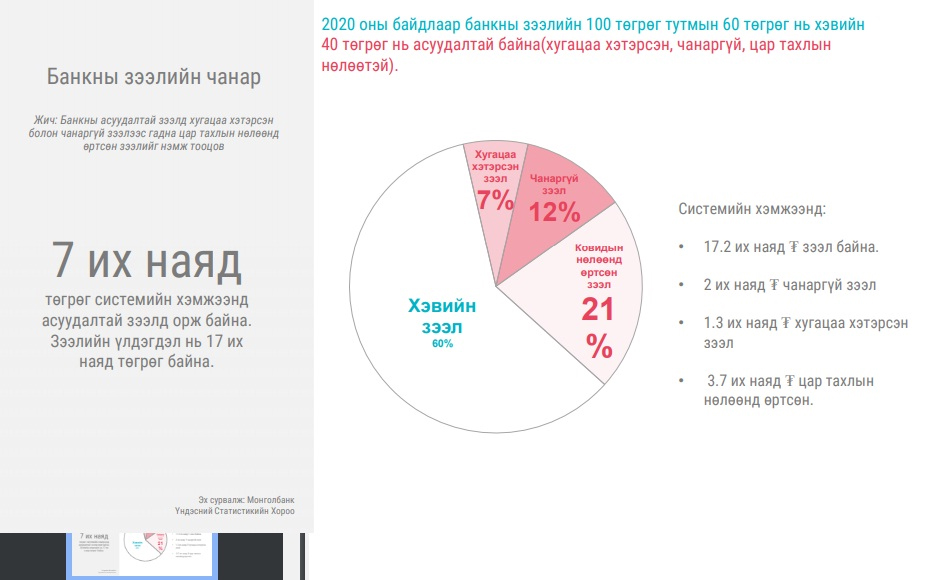 Арилжааны банкууд өнгөрсөн оны эцэс гэхэд эдийн засагт 17.2 их наяд төгрөгийн зээл гаргаад байсан. Үүний 40 хувь буюу 6.9 их наяд төгрөг нь КОВИД-19 цар тахлын нөлөөнд орж эрсдэлд орсон гэж тухайн үед тайлбарласан юм. Ингэхдээ энэ оны III улирлын эцэс гэхэд банкнаас гарсан 100 төгрөгийн зээл тутмын 40 төгрөг эргэж төлөгдөх эсэх нь эрсдэлтэй болно гэж анхааруулж байлаа. Эрсдэлтэй 6.9 их наяд төгрөгийг задалбал, хоёр их наяд нь чанаргүй зээл, 1.2 их наяд нь хугацаа хэтэрсэн зээл, 3.7 их наядыг нь цар тахлын улмаас иргэд, аж ахуйн нэгжүүдийн төлөх чадваргүй болсон зээл эзэлж байсан.
