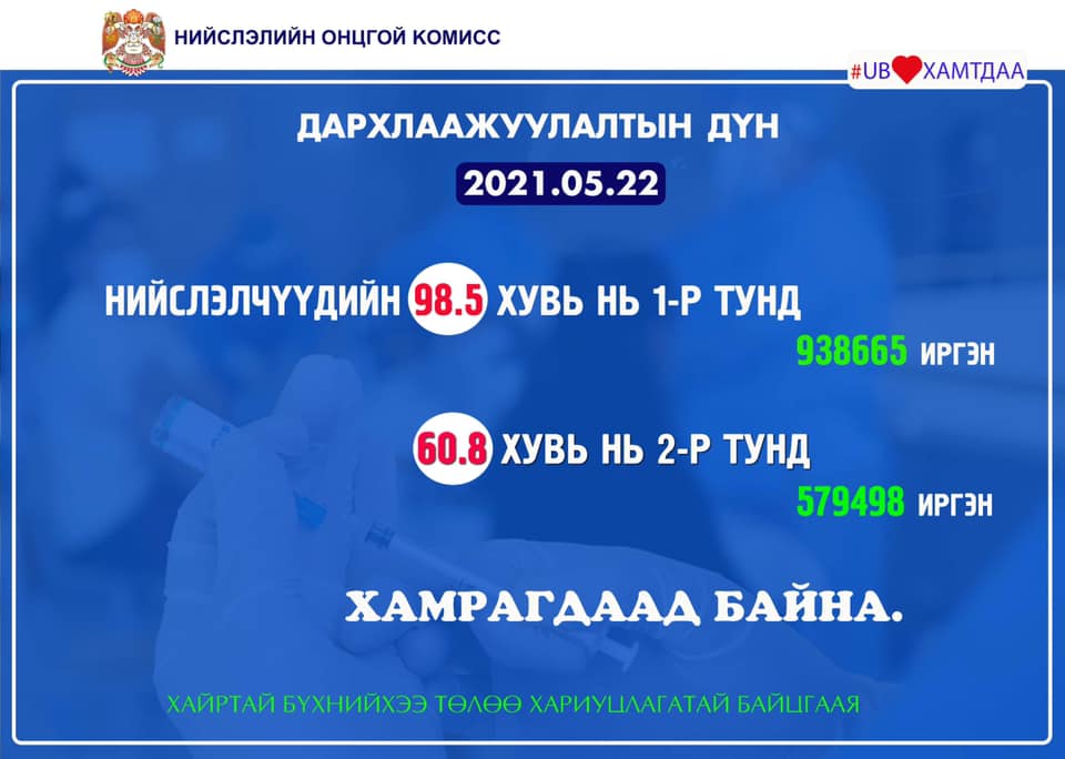 Вакцинжуулалт эхэлснээс хойш нийслэлийн 18-аас дээш насны иргэдийн 98.5 хувь буюу 938.665 нь I тунд, 60.8 хувь буюу 579.498 нь II тунд хамрагдаад байна.