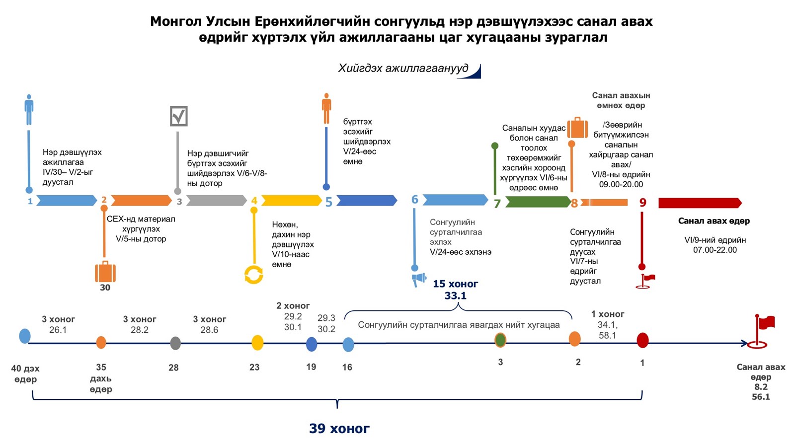 Монгол Улсын Ерөнхийлөгчийн ээлжит сонгуулийг ирэх зургаадугаар сарын 09-ний өдөр зохион байгуулахаар хуульчилсан билээ. Тэгвэл Монгол Улсын Ерөнхийлөгчийн сонгуульд нэр дэвшүүлэхээс санал авах өдрийг хүртэлх үйл ажиллагааны цаг хугацааны зураглалыг “СОНГОГЧДЫН БОЛОВСРОЛ”-д зориулан, бэлтгэн хүргэж байна.