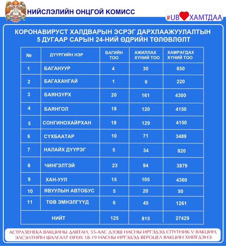 Улаанбаатар хотод өнөөдөр /2021.05.21/ 5 явуулын, 57 суурин цэгт, 125 багийн 815 эмч, ажилтан ажиллаж, 27429 иргэнийг дархлаажуулна.