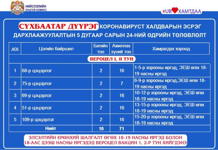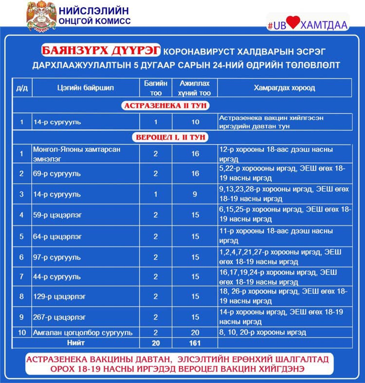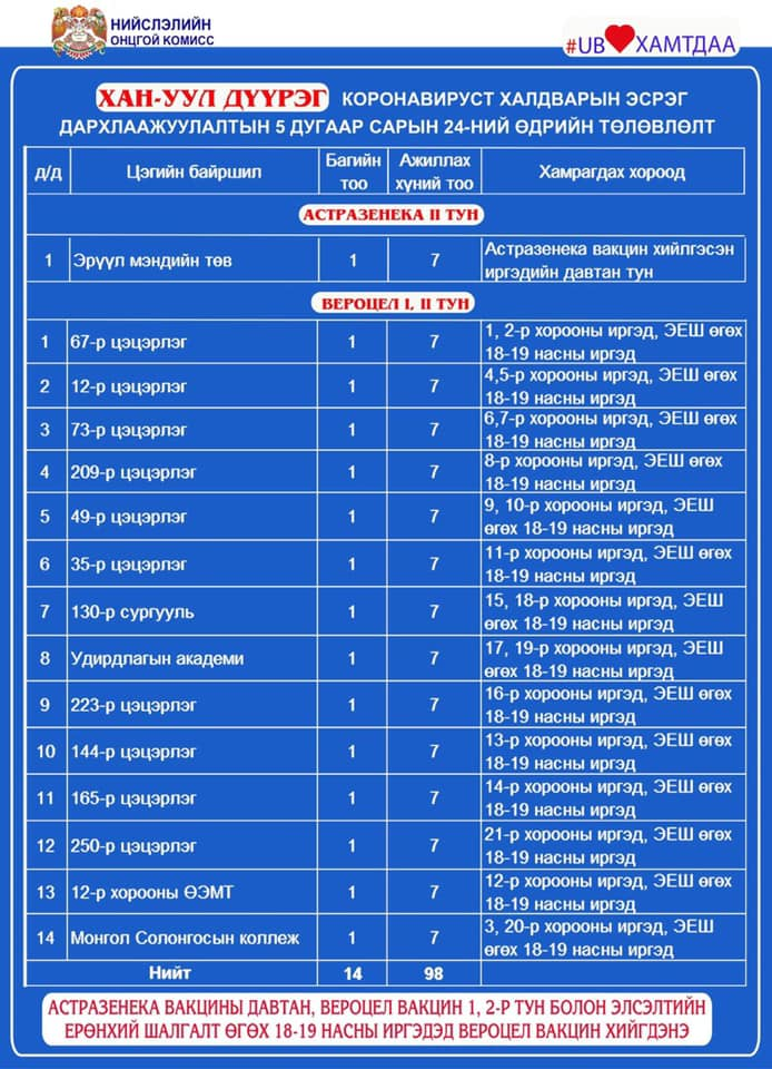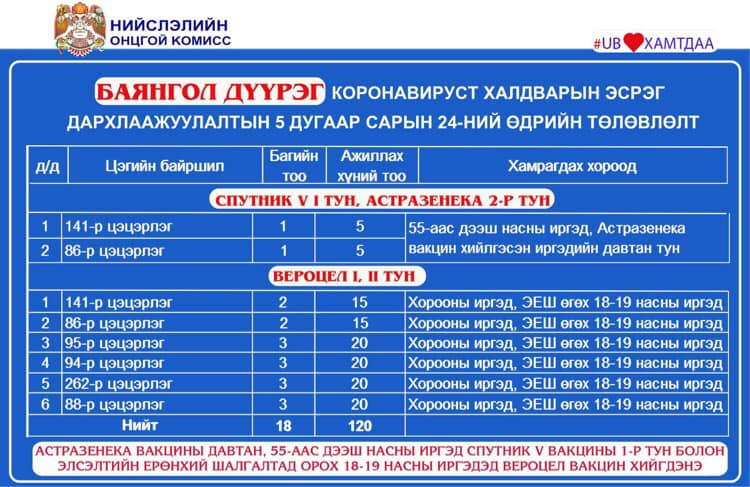 ЭМЯ-өөс өгч буй мэдээллээр сүүлийн 24 цагт Улаанбаатар хот болон хөдөө орон нутагт 24.084 хүн дархлаажуулалтад хамрагдсан байна. Үүнээс Улаанбаатарт 12.885, хөдөө орон нутагт 12.199 хүн дархлаажуулалтад хамрагджээ.