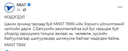 МИАТ-ын Зорчигч үйлчилгээний хэлтсийн дарга С.Батсүх төрийн албан хаагчийг дарамталж, зүй бусаар харьцаж буй бичлэг цацагдсан. Тэгвэл цахим орчинд цацагдсан мэдээлэлтэй холбоотойгоор МИАТ ТӨХК-иас мэдэгдэл гаргасан байна.