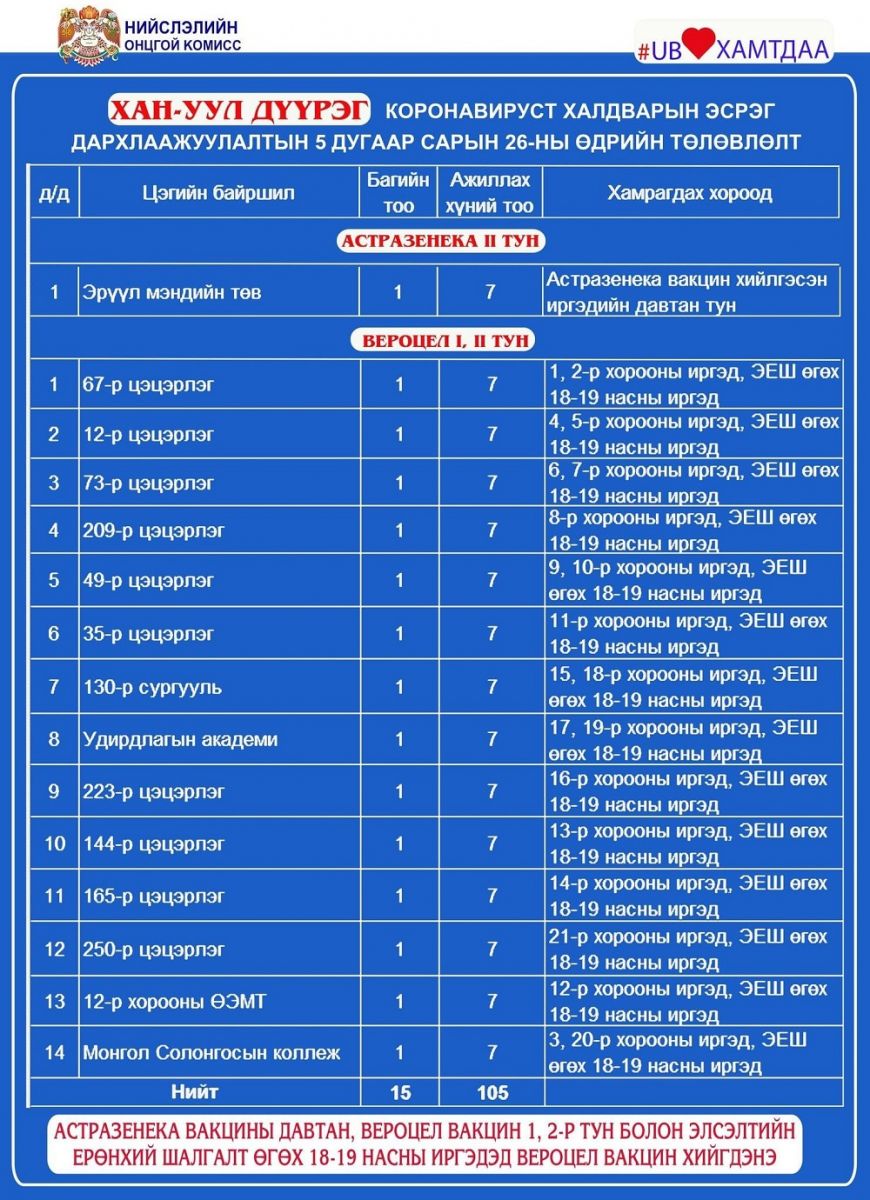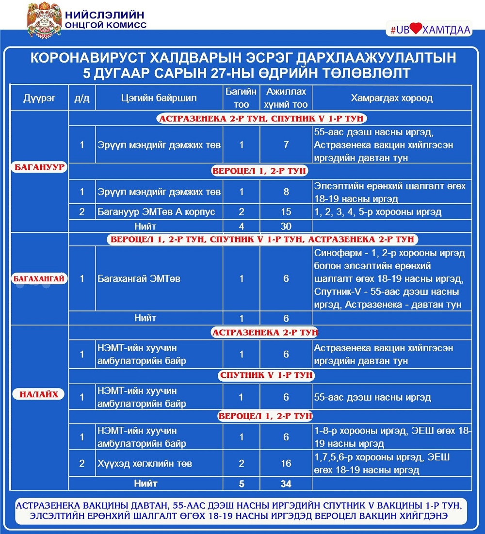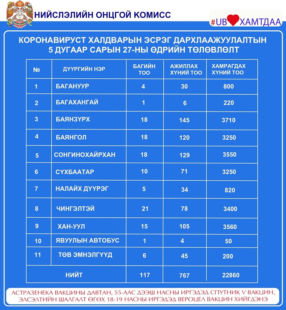 Улаанбаатар хотод өнөөдөр /2021.05.27/ явуулын нэг, суурин 56 цэгт дархлаажуулалтын 117 багийн 767 эмч, ажилтан ажиллаж, 22860 иргэнийг дархлаажуулна.