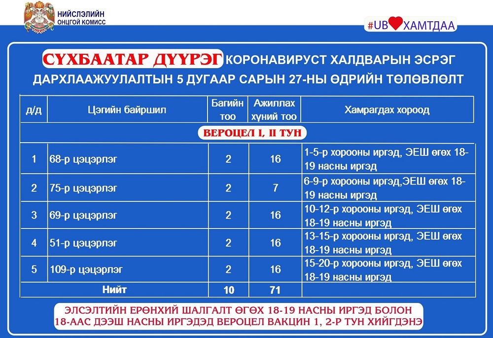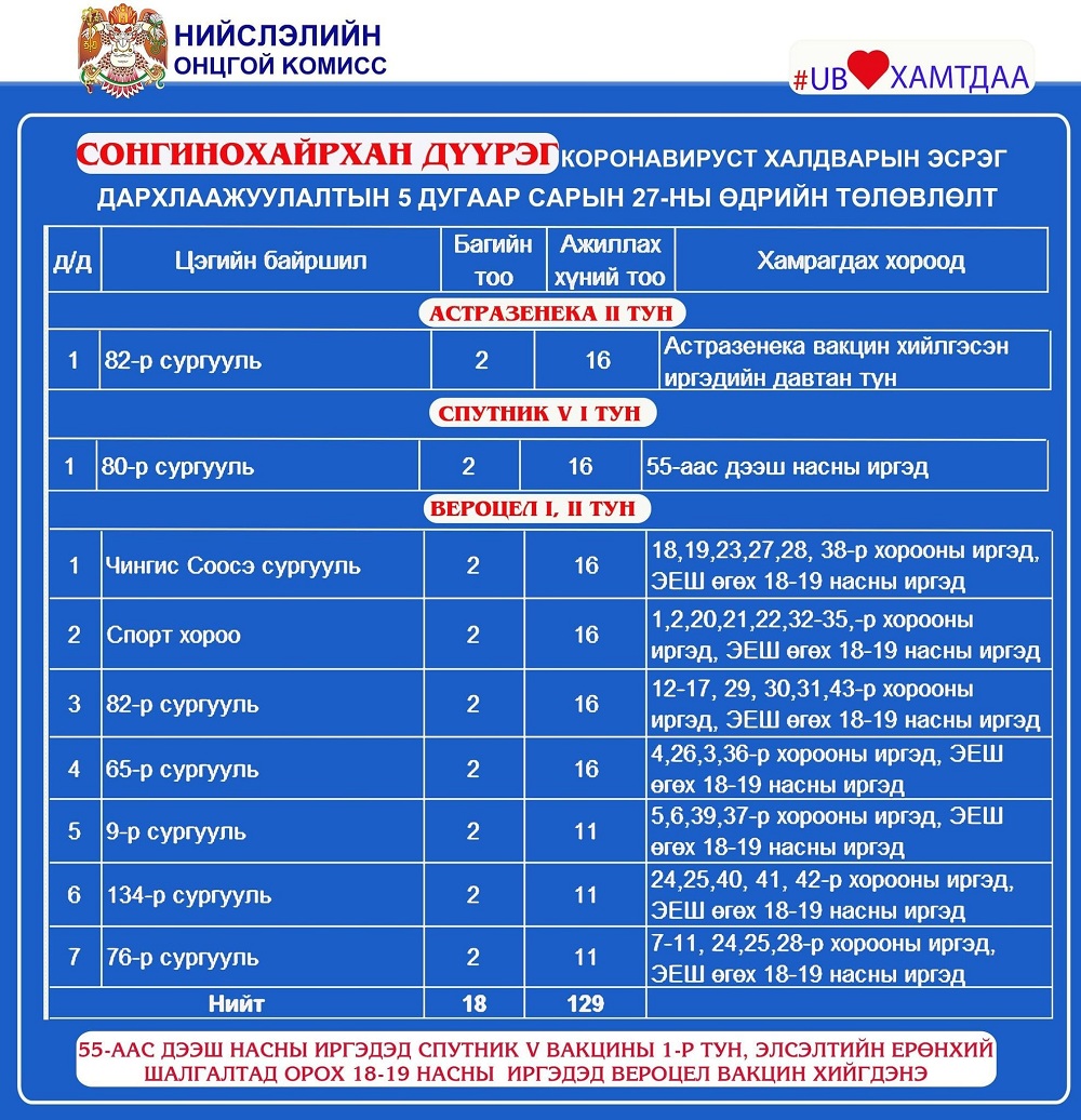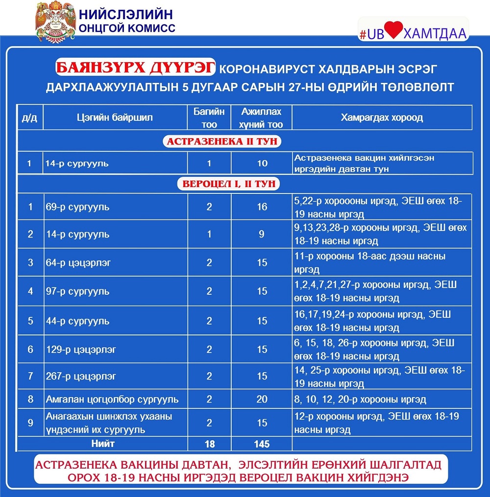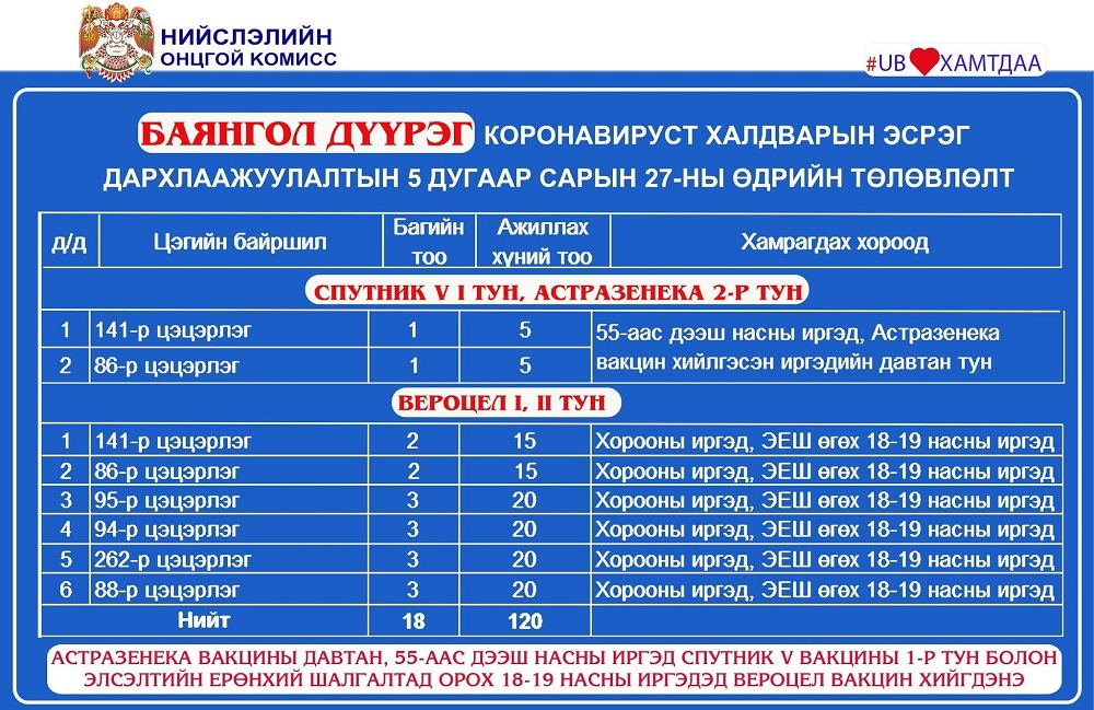 Улаанбаатар хотод өнөөдөр /2021.05.27/ явуулын нэг, суурин 56 цэгт дархлаажуулалтын 117 багийн 767 эмч, ажилтан ажиллаж, 22860 иргэнийг дархлаажуулна.