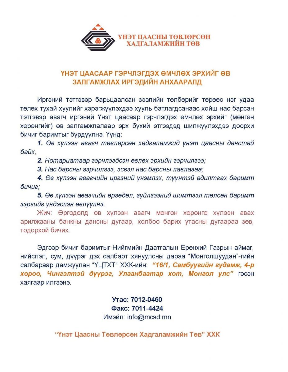 2019 оны арванхоёрдугаар сарын 31-нээс хойш нас барсан хүмүүсийн мөнгийг өвлүүлэх замаар ар гэрийнхэнд нь олгох юм байна. Үнэт цаас өвлөгдсөн иргэд доорх зааврын дагуу бичиг баримтаа бүрдүүлэн ҮЦТХТ-д хандах ёстой аж.