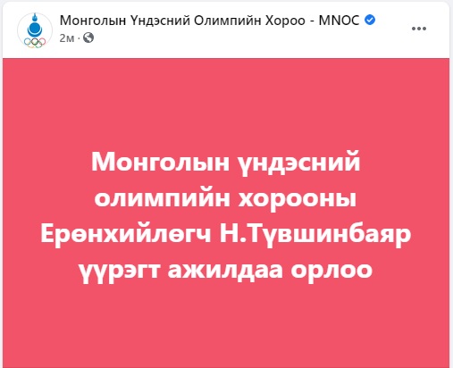 Монголын үндэсний олимпийн хороо (МҮОХ)-ны ерөнхийлөгч Н.Түвшинбаяр өнөөдрөөс үүрэгт ажилдаа орсон талаар МҮОХ-ноос мэдээллээ.