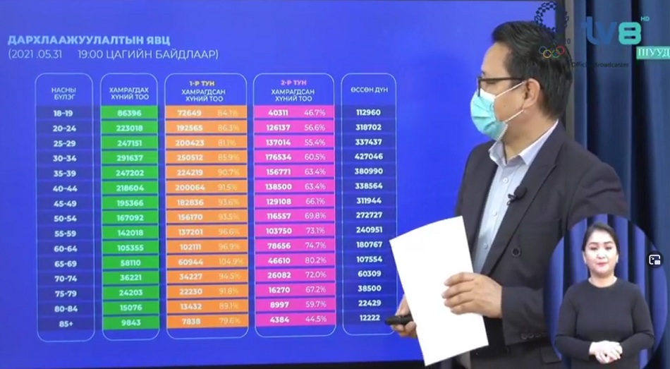 Эрүүл мэндийн яамнаас өгсөн коронавирусний халдварын нөхцөл байдлын өнөөдрийн (2021.06.01) ээлжит мэдээллийн үеэр ковидын эсрэг вакцинжуулалтын талаар дараах мэдээллийг өглөө.