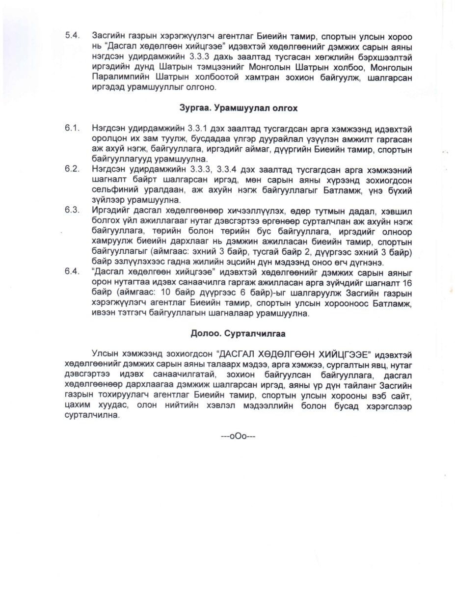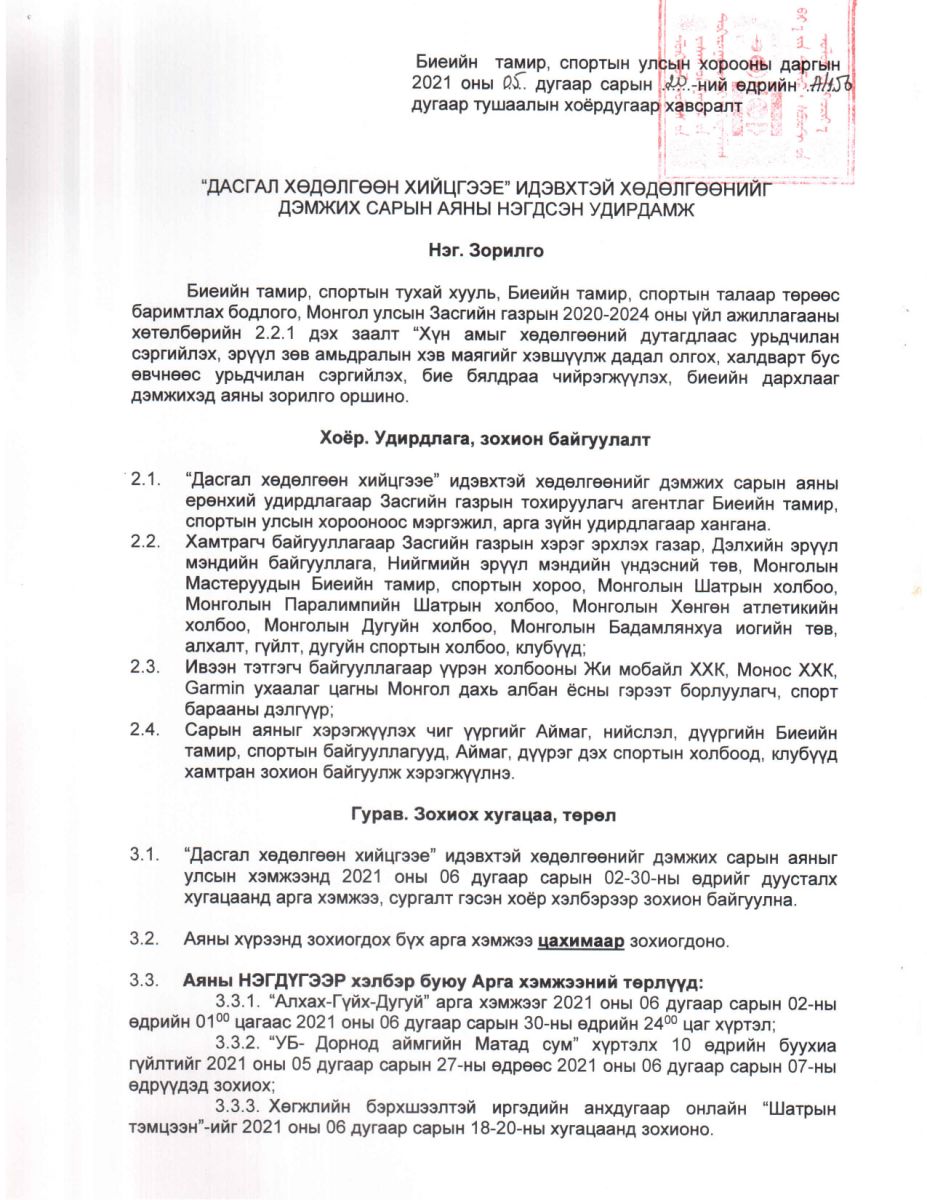 Монгол Улсын Засгийн газрын хэрэг эрхлэх газар, Биеийн тамир, спортын улсын хороо, Нийгмийн эрүүл мэндийн үндэсний төв, Дэлхийн эрүүл мэндийн байгууллага болон бусад төрийн бус байгууллагуудтай хамтран “Хүн амыг хөдөлгөөний дутагдлаас урьдчилан сэргийлэх, эрүүл зөв амьдралын хэв маягийг хэвшүүлж дадал олгох, халдварт бус өвчнөөс урьдчилан сэргийлэх, бие бялдраа чийрэгжүүлэх, биеийн дархлааг дэмжих” зорилгоор “Дасгал хөдөлгөөн хийцгээе” идэвхтэй хөдөлгөөнийг дэмжих сарын аяныг эхлүүллээ.