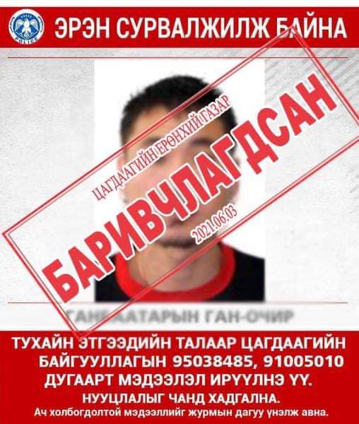 Тэгвэл эрэн сурвалжлагдаж байсан иргэн Г.Ган-Очирыг өнгөрсөн шөнө баривчилжээ. Энэ талаар ЦЕГ-ын албан ёсны цахим хуудаснаа нийтэлсэн байна.