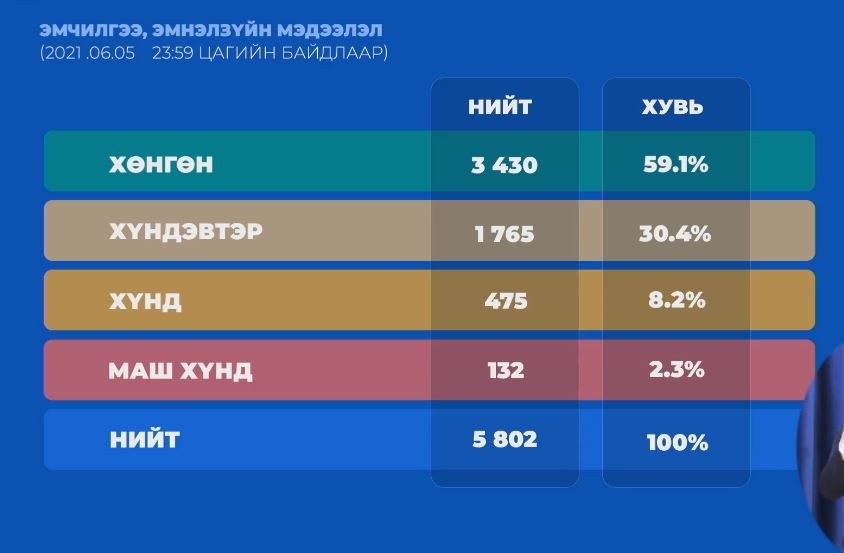 Уг вирусний хүнд хэлбэрийн улмаас өнгөрсөн хоногт 4 иргэн амиа алджээ. Өнөөдрийн байдлаар уг вирусний хөнгөн хэлбэрээр өвчилсөн 5349 иргэнийг гэрээр нь эмчилж байгаа гэж Эрүүл мэндийн яамнаас мэдээллээ. Энэ долоо хоногт батлагдсан коронавирусний тохиолдлын тоо 7.700 болсон байна. Уг өвчний тархалт маш өндөр байгааг анхаарууллаа.
