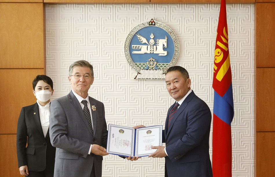 Монгол Улсын төрийн дээд шагнал Алтан гадас одон гардан авсан Элчин сайд И.К.Азизовт Монгол Улсын Ерөнхийлөгч Халтмаагийн Баттулга ажлын өндөр амжилт хүслээ.