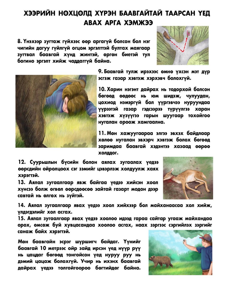 Иймд малчид, мал бүхий болон аялал зугаалгаар явж буй иргэд хүрэн баавгайн дайралтаас урьдчилан сэргийлэх, таарсан үед авах арга хэмжээний зөвлөмжтэй танилцаж, анхаарал боломжтой байхыг зөвлөж байна.