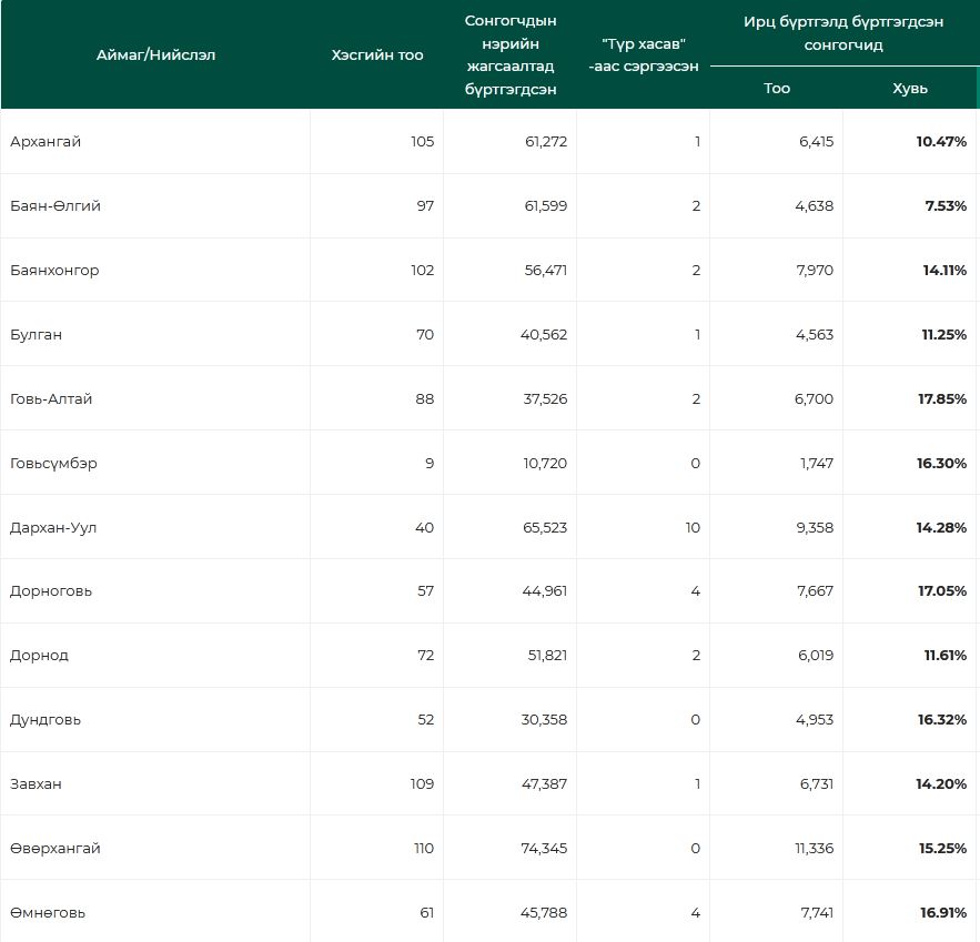 Харин гадаадаас санал өгөх эрхтэй 7,394 иргэн байсны 5,618 нь санал хураалтад оролцжээ. Үүнээс гадна ял эдэлж байгаа болон бусад шалтгаанаар "Түр хасав" тэмдэглэгээтэй 110,545 сонгогч бүртгэгджээ.