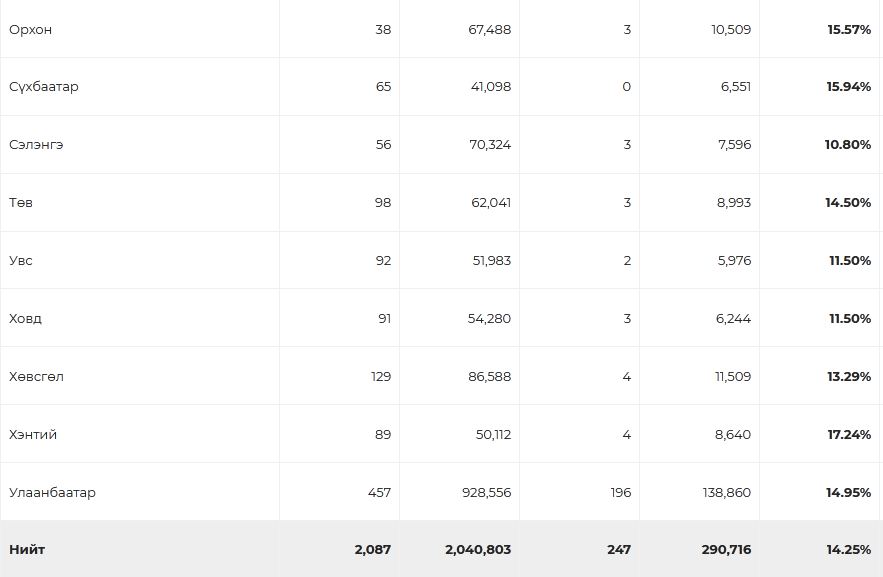 Саналын эрхтэй 2 сая 40 мянга 784 иргэн байгаагаас 11:00 цагийн байдлаар 267,614 сонгогч саналаа өгсөн ба санал хураалтын ирц 13.4%-тай үргэлжилж байна.