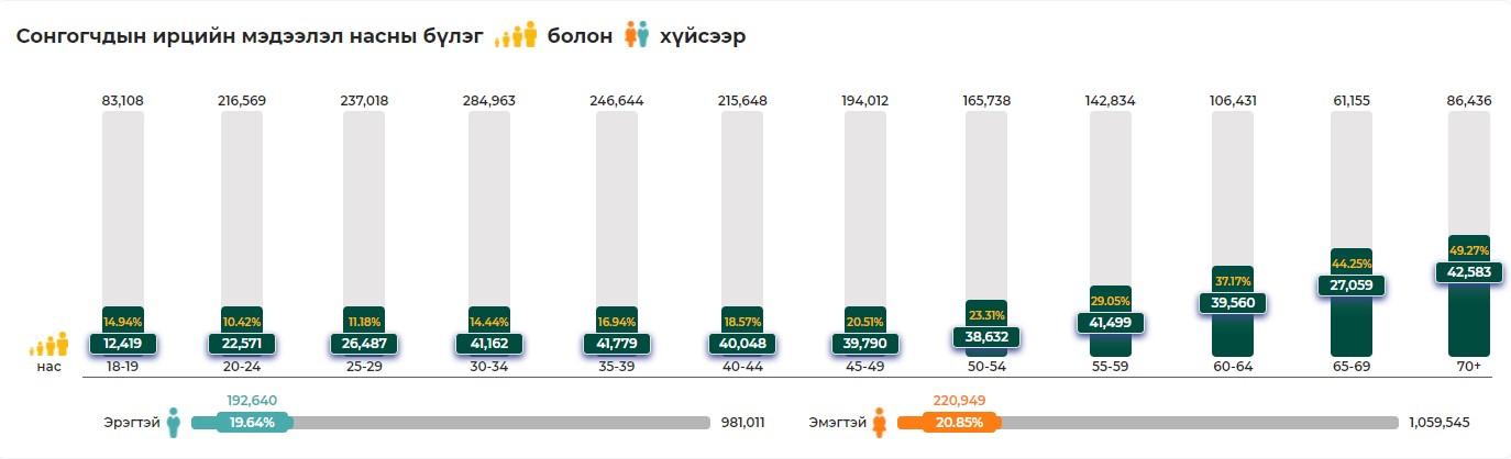 Одоогийн байдлаар 70-аас дээш насны сонгогчдын ирц 50 хувьд хүрээд байна.