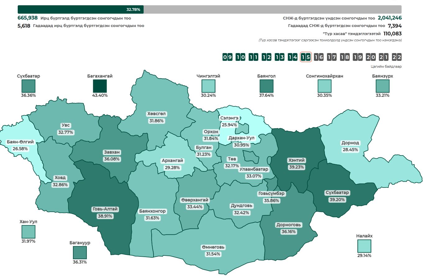 Энэ удаагийн сонгуульд санал өгөх 2.040.784 иргэн байгаагаас 15:00 цагийн байдлаар 665.938 сонгогч саналаа өгсөн ба санал хураалтын ирц 32.78 хувьтай үргэлжилж байна.