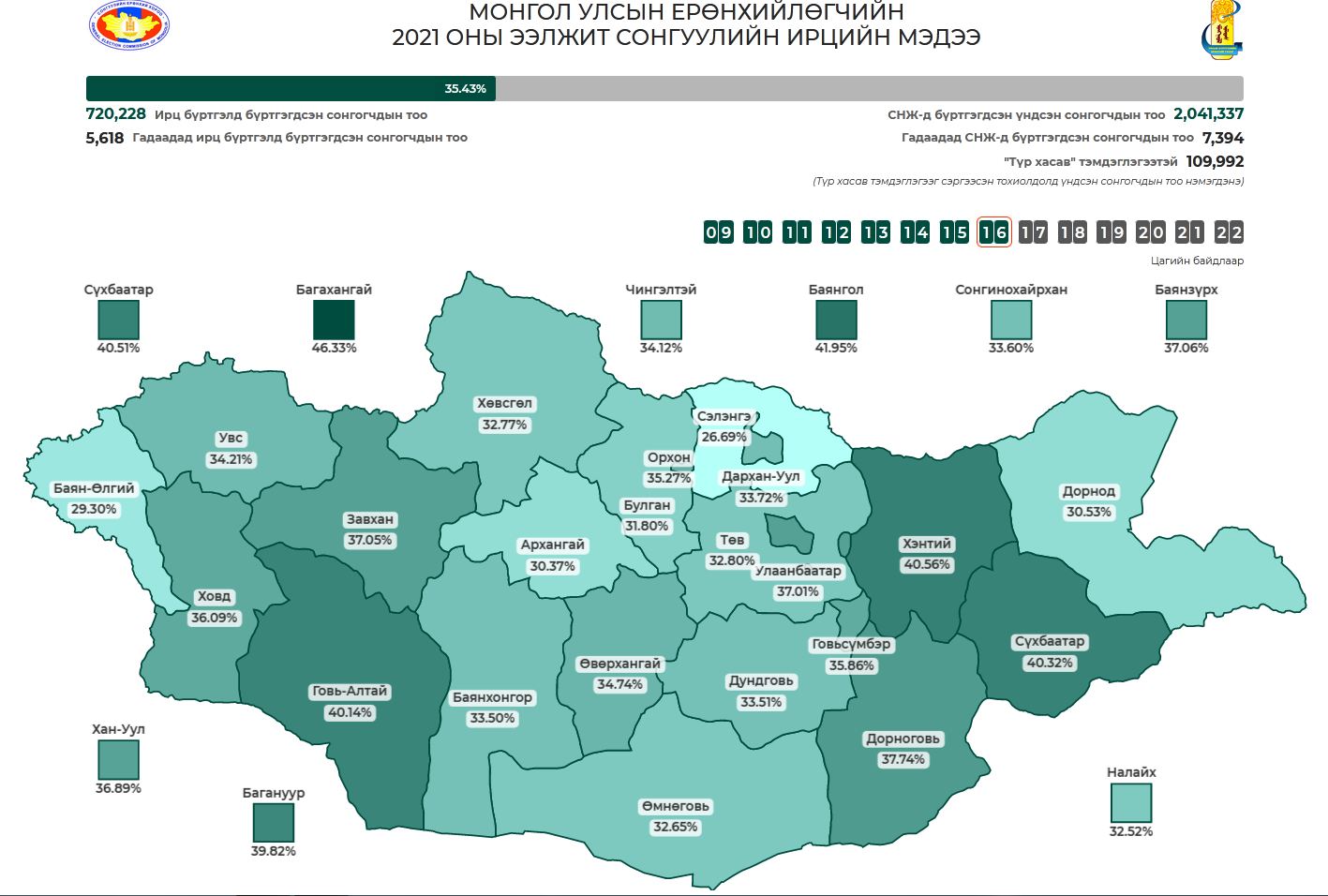 Энэ удаагийн сонгуульд санал өгөх 2.040.784 иргэн байгаагаас 16:00 цагийн байдлаар 720.228 сонгогч саналаа өгсөн ба санал хураалтын ирц 35.43 хувьтай үргэлжилж байна.