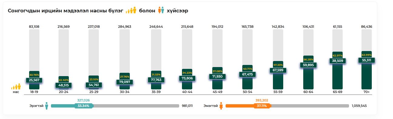 Сонгогчдын ирцийг насны бүлгээр авч үзвэл 70-аас дээш насынхан хамгийн идэвхтэй буюу 55.311 (63.99%) иргэн , хамгийн идэвх муутай нь 20-24 насныхан 48.515 буюу 22.40 хувьтай явж байна.