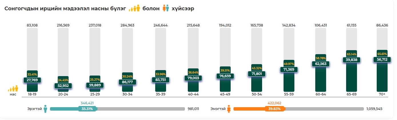 Сонгогчдын ирцийг насны бүлгээр авч үзвэл 70-аас дээш насынхан хамгийн идэвхтэй буюу 56.712 (65.61%) иргэн саналаа өгсөн бол хамгийн идэвх муутай нь 20-34 насныхан байна.