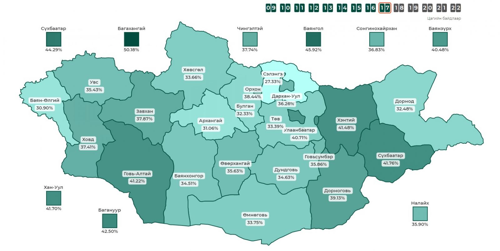 Харин сонгогчдын ирцийг аймгаар нь авч үзвэл, хамгийн идэвх өндөртэй Хэнтий, Сүхбаатар, Говь-Алтай аймгуудын ирц 40-өөс дээш хувьтай байгаа бол хамгийн бага хувьтай нь Сэлэнгэ аймаг байна.