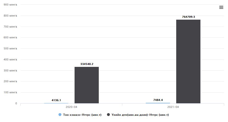 БНХАУ-ын гааль манай улсаас импортлох нүүрсний тээврийг дөрөвдүгээр сарын турш хатуу хязгаарласан. Гэхдээ дөрөвдүгээр сарын байдлаарх нүүрсний экспортыг өнгөрсөн оны мөн үетэй харьцуулахад 3,348.2 мянган тонноор нэмэгдсэнийг дараах график харуулж байна.