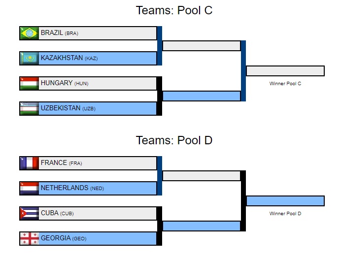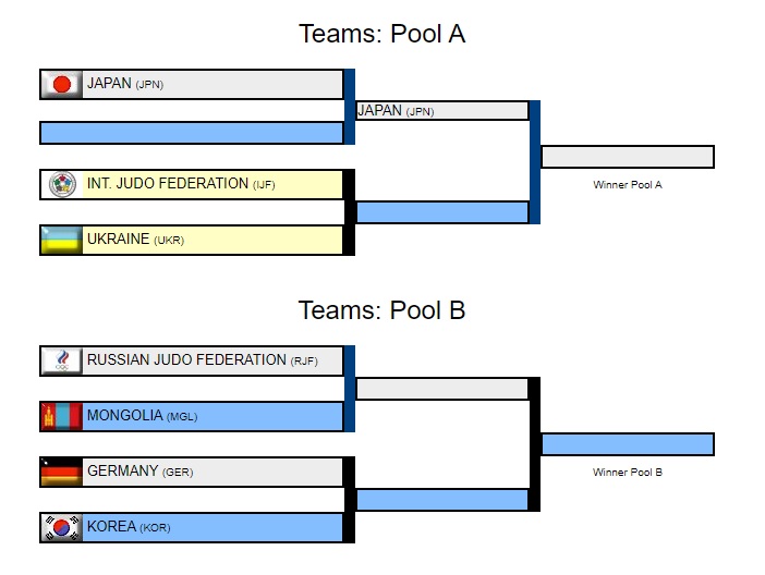 Дөрвөн хэсгээс түрүүлсэн багууд хагас шигшээд шалгарна. В хэсэгт түрүүлсэн баг А хэсгийн аваргатай хагас шигшээд таарна. А хэсэгт Япон, Украин, IJF холбооны баг багтсан байгаа тул хүндхэн сугалаа болжээ.