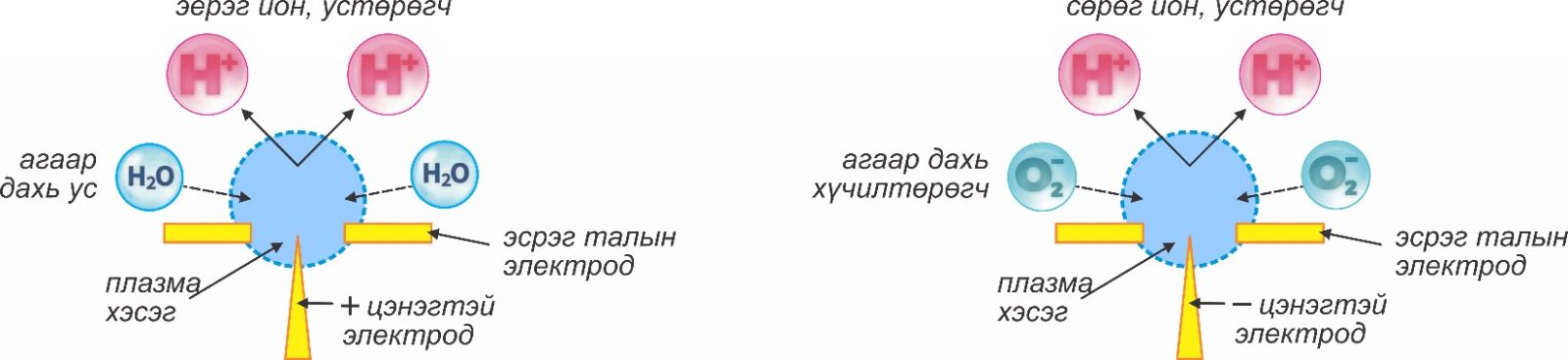 Цэнэглэгч электродоор эерэг болон сөрөг гүйдэл дамжуулахад агаар дахь ус болон хүчилтөрөгч цахилгаанжин задардаг. Энэ нь эерэг цэнэгээр цэнэглэгдсэн устөрөгчийн ион (H+), сөрөг цэнэгээр цэнэглэгдсэн хүчилтөрөгчийн ион (O-) үүсгэдэг.
