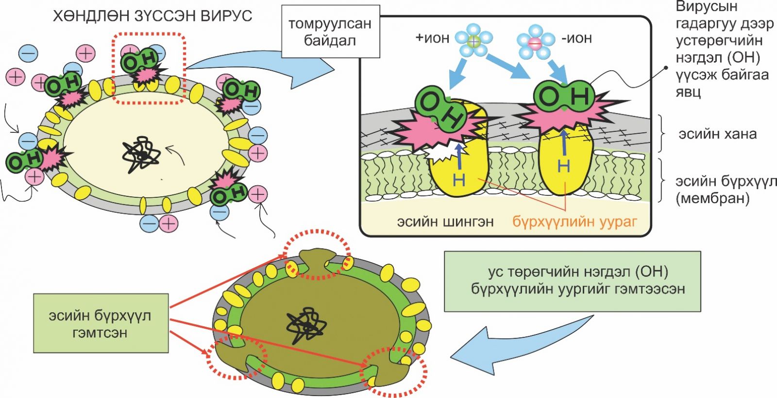 Плазмакласер ионууд нь вирусын гадаргуу дээр устөрөгчийн радикал (OH) үүсгэж суудаг бөгөөд эсийн уургаас устөрөгчийг (H) нь татаж өөртөө нэгтгэн ус (H2O) болж агаарт дэгддэг. Энэ явцад эсийн бүрхүүл гэмтдэг бөгөөд цаашид амьдрах чадваргүй болдог байна.