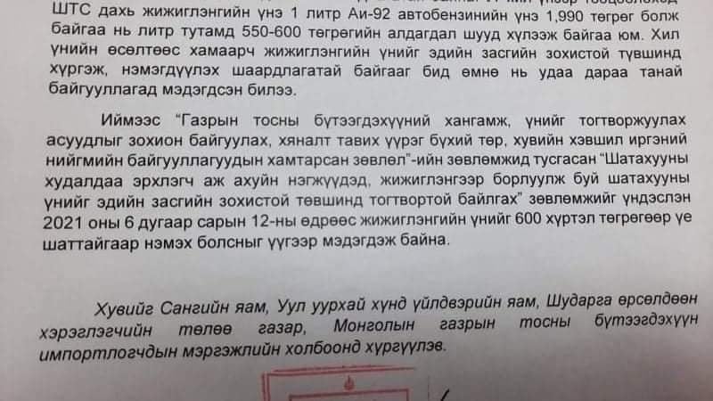 Шатахуун импортлогчид Аи-92 автобензинийн үнийг 550-600 төгрөгөөр нэмэгдүүлнэ гэх албан бус мэдээлэл сошиалд цацагдаж эхэллээ. Шатахууны үнийг нэмэх тухай мэдэгдлээ Сангийн яам, Уул уурхай хүнд үйлдвэрийн яам, Шударга өрсөлдөөн хэрэглэгчийн төлөө газарт хүргүүлсэн гэх.