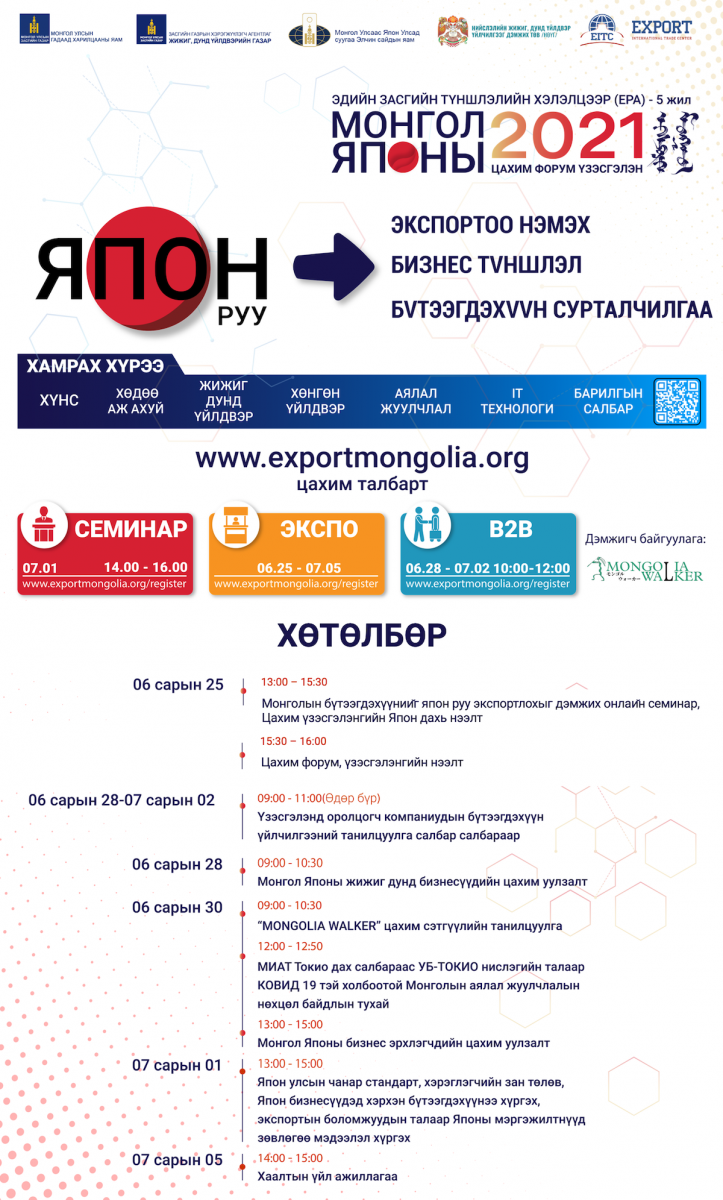 Монгол үндэсний ёс заншил, нүүдэлчдийн соёл иргэншлийн онцлогийг тусгасан хүнс, хөнгөн, хүнд, жижиг, дунд үйлдвэрийн салбарын бүтээгдэхүүнийг Японы хэрэглэгчдэд таниулах, сурталчлах, холбоо тогтоох, Японы хэрэглэгчдийн таашаалд нийцсэн байгалийн гаралтай органик бүтээгдэхүүний экспортын хэмжээ, нэр төрлийг нэмэгдүүлэхэд энэхүү цахим форум, үзэсгэлэн ихээхэн ач холбогдолтой. Японы бизнесүүдтэй харилцаа холбоо тогтоож, Япон улсад бүтээгдэхүүн экспортлох сонирхолтой аж ахуй нэгж, үйлдвэрлэгчид маань энэхүү https://www.exportmongolia.org/  цахим платформд нэгдэхийг урьж байна гэлээ. Монгол Японы цахим форум, үзэсгэлэн энэ сарын 25-аас ирэх сарын 5-ны өдрийг хүртэл зохион байгуулагдах юм байна.