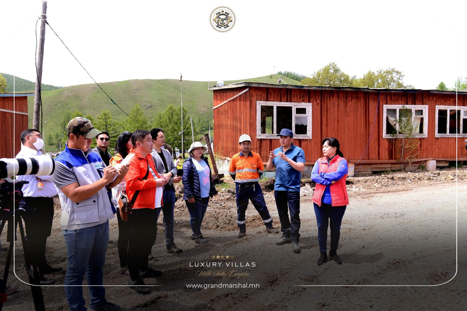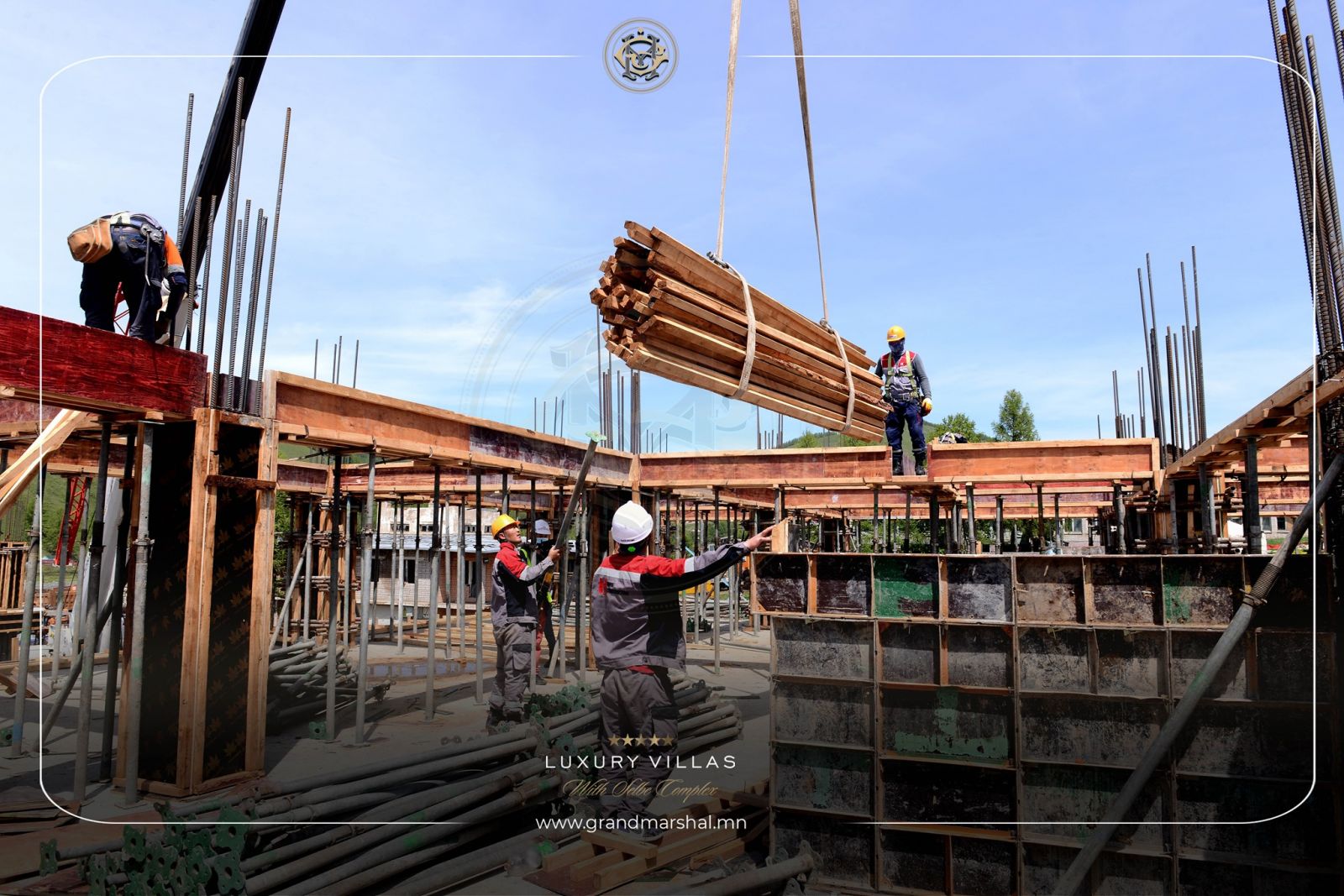 Энд гинжит экскаватор овоолсон хайрга, дайргыг шанагаараа тараан засаж, тэнд зуурмагийн машин цемент зөөж, нөгөө хэсэгт каск малгай өмсөж, хөдөлмөрийн аюулгүй байдлаа хангасан ажилчид арматур төмрийг хэмжих, цемент зуурмагийн чанар шалгах зэргээр дор бүрнээ хариуцсан ажлаа хийцгээнэ. Нийт 13.2 га талбайтай “Grand Marshal Luxury Villas” цогцолбор хотхон сүндэрлэж байгаа ба чадварлаг инженерүүд ур ухаанаа шингээн, ажиллаж байна.