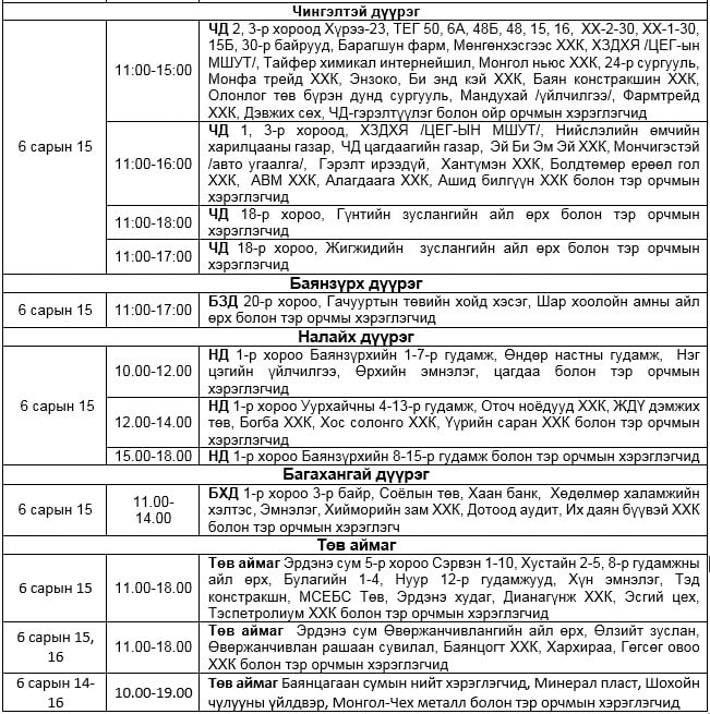 Маргааш /2021.06.15/ дараах хаяг, байршлуудад цахилгаан хязгаарлаж, цахилгаан шугам тоноглолд засвар үйлчилгээ хийнэ гэж УБЦТС ТӨХК- аас мэдээлээ.