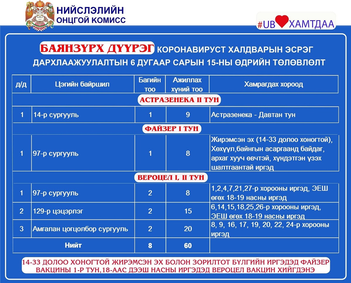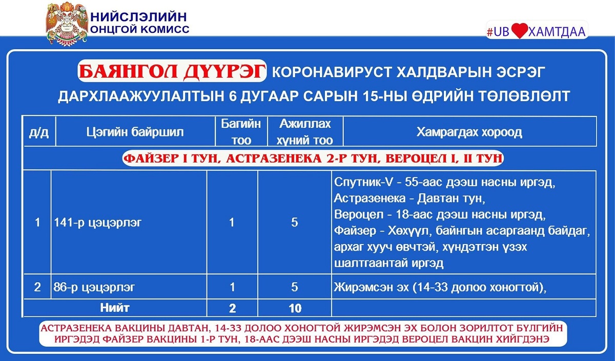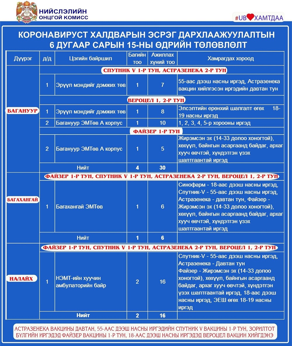 Улаанбаатар хотод өнөөдөр /2021.06.15/ суурин 35, явуулын 8 цэгт 65 багийн 361 эмч, эмнэлгийн мэргэжилтэн ажиллаж, 4560 иргэнийг дархлаажуулна.