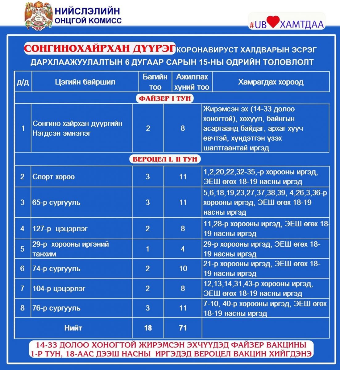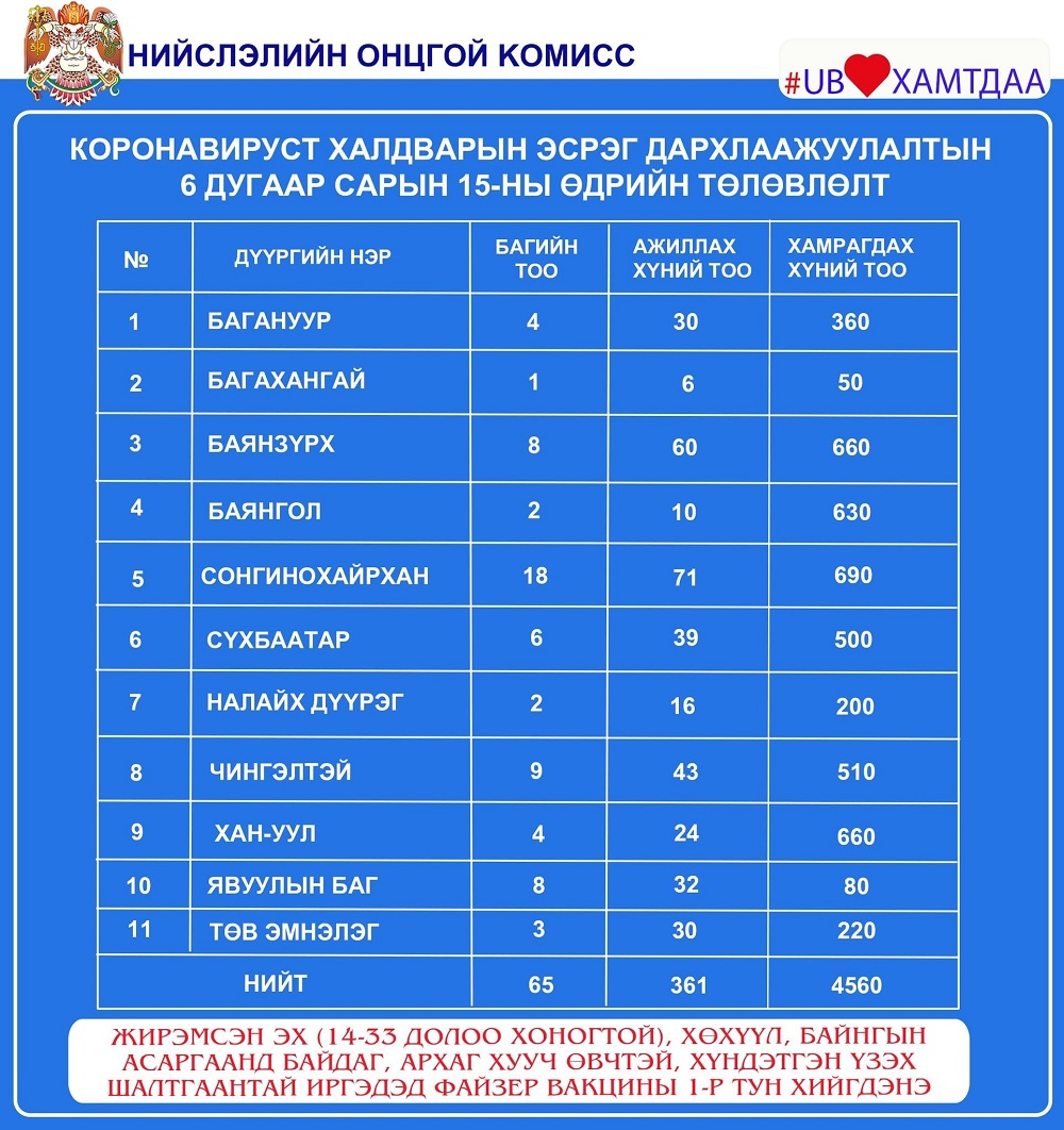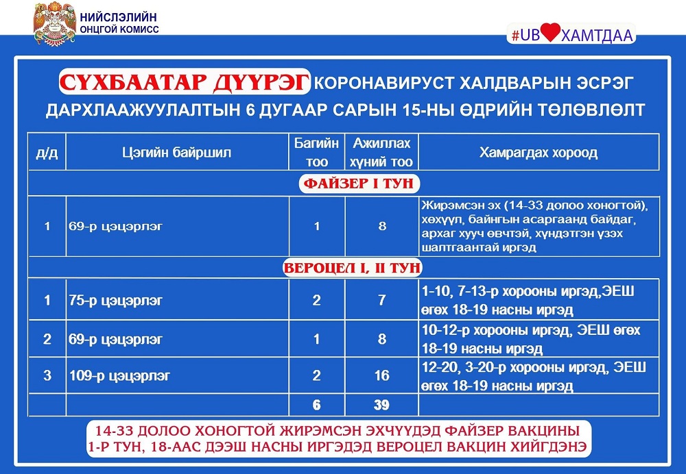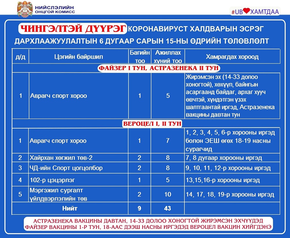 Улаанбаатар хотод өнөөдөр /2021.06.15/ суурин 35, явуулын 8 цэгт 65 багийн 361 эмч, эмнэлгийн мэргэжилтэн ажиллаж, 4560 иргэнийг дархлаажуулна.
