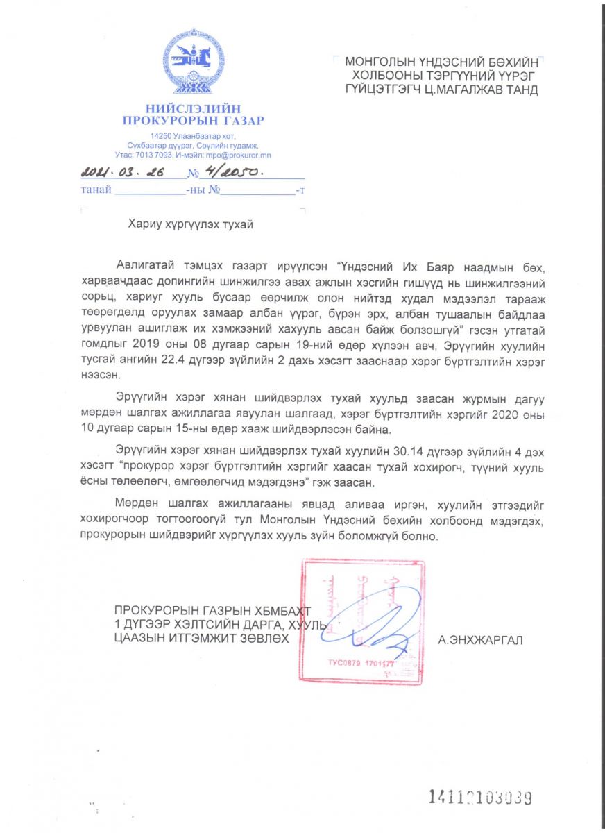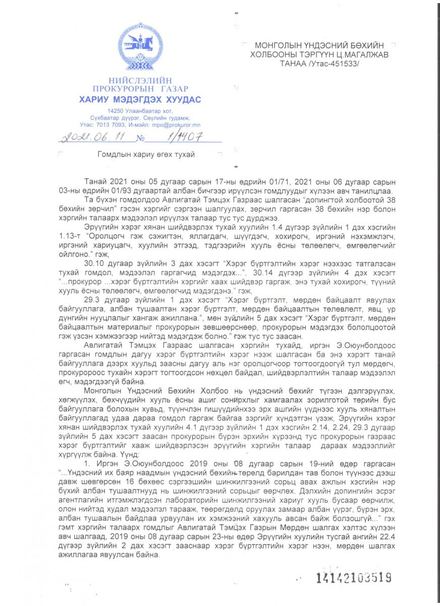 4. Монголын Үндэсний Бөхийн Холбооноос Нийслэлийн прокуорын газарт ирүүлсэн 2021 оны 03 дугаар сарын 22-ны өдрийн 01/64 дугаартай “Допингтой холбоотой хэргийг татаж хянуулах тухай” албан бичгийг орлогч прокурор А.Энхжаргал хүлээн авч танилцаад, 2021 оны 03 дугаар сарын 26-ны өдрийн 4/2050 дугаартай албан бичгээр “...Эрүүгийн хэрэг хянан шийдвэрлэх тухай хуулийн 30.14 дүгээр зүйлийн 4 дэх хэсэгт “...прокурор хэрэг бүртгэлтийн хэргийг хаасан тухай хохирогч, түүний хууль ёсны төлөөлөгч, өмгөөлөгчид мэдэгдэнэ” гэж заасан. Мөрдөн шалгах ажиллагааны явцад аливаа иргэн, хуулийн этгээдийг хохирогчоор тогтоогоогүй тул Монголын Үндэсний Бөхийн Холбоонд мэдэгдэх, прокурорын шийдвэрийг хүргүүлэх хууль зүйн боломжгүй болно” гэсэн хариуг танай холбоонд хүргүүлжээ.