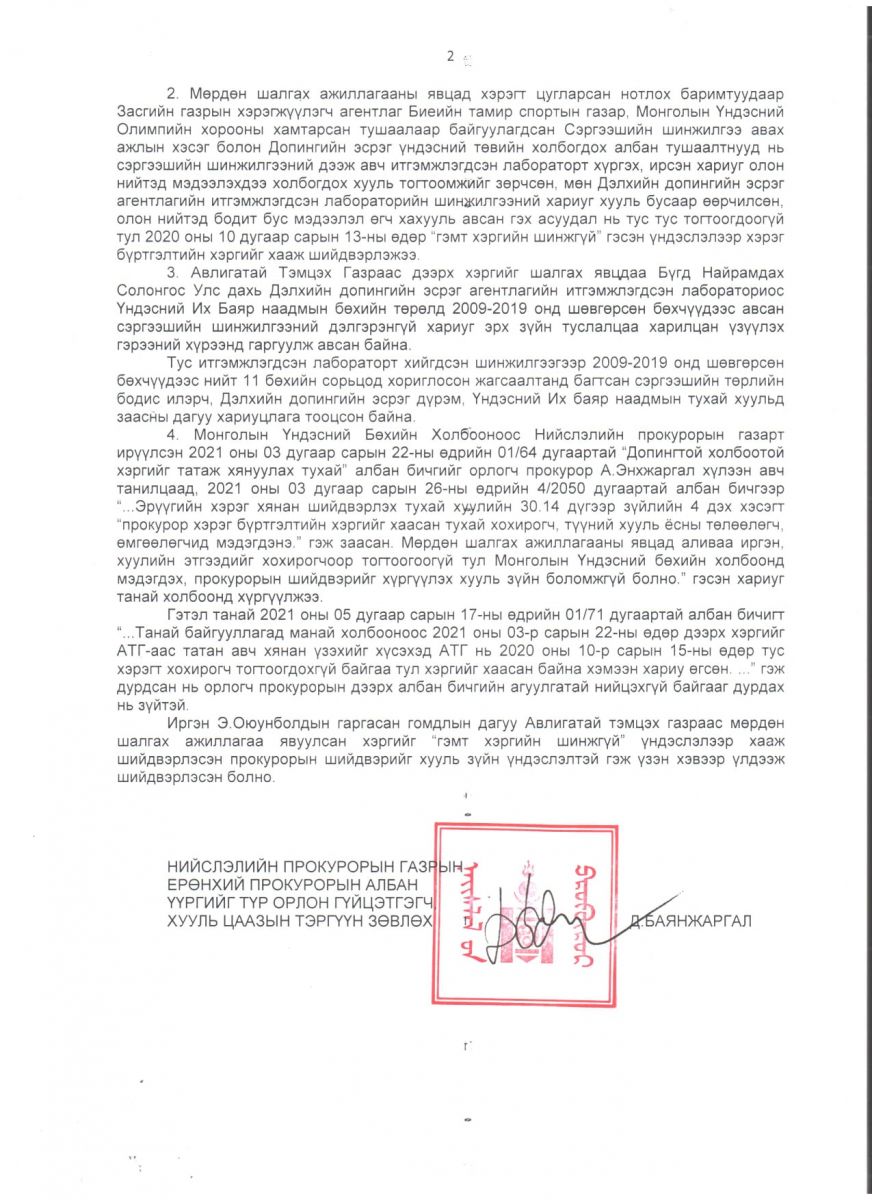 2. Мөрдөн шалгах ажиллагааны явцад хэрэгт цугларсан нотлох баримтуудаар Засгийн газрын хэрэгжүүлэгч агентлаг Биеийн тамир спортын газар, Монголын Үндэсний Олимпийн хорооны хамтарсан тушаалаар байгуулагдсан Сэргээшийн шинжилгээ авах ажлын хэсэг болон Допингийн эсрэг үндэсний төвийн холбогдох албан тушаалтнууд нь сэргээшийн шинжилгээний дээж авч, итгэмжлэгдсэн лабораторт хүргэх, ирсэн хариуг олон нийтэд мэдээлэхдээ холбогдох хууль тогтоомжийг зөрчсөн, мөн Дэлхийн допингийн эсрэг агентлагийн итгэмжлэгдсэн лабораторийн шинжилгээний хариуг хууль бусаар өөрчилсөн, олон нийтэд бодит бус мэдээлэл өгч, хахууль авсан гэх асуудал нь тус тус тогтоогдоогүй тул 2020 оны 10 дугаар сарын 13-ны өдөр “Гэмт хэргийн шинжгүй” гэсэн үндэслэлээр хэрэг бүртгэлтийн хэргийг хааж шийдвэрлэжээ.