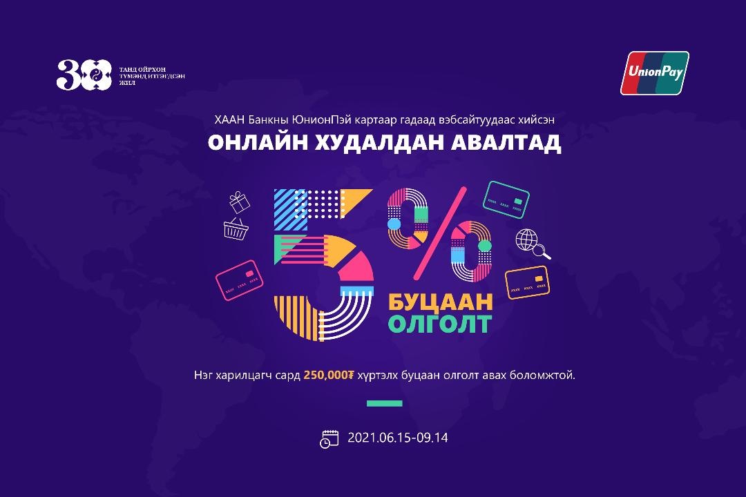 Аялал, шоппинг гээд амьдралд өнгө нэмж, зуныг зугаатай болгох зүйлс олон. Ковидоос болоод энэ зуны төлөвлөгөөнөөсөө эдгээрийг хасчихсан суугаа юм биш биз? Дэлхий дахинаа виртуал аялал, онлайн худалдаа энэ зуны трэнд болоод байхад гар утас, компьютерээ ашиглаад л хүссэн дэлгүүрээ хэсэж, дэлхийд гайхагдсан архитектурын шилдэг шийдлийг гэрээсээ шимтэх боломжтой. Үүнтэй холбогдуулан ХААН Банкнаас дэлгэр зуныг угтсан картын худалдан авалтын буцаан олголтын урамшууллаа зарлалаа. Та ХААН Банкны бүх төрлийн ЮнионПэй картаараа 2021.06.15-2021.09.14-ний өдрийг дуустал олон улсын онлайн худалдааны аль ч сайтаас хэрэгцээт бараа, бүтээгдэхүүнээ худалдан аваад үнийн дүнгийн 5%-ийг буцаан авах боломжтой. Мөн Хятад, Орос, Солонгос, Япон, Турк улсад ажиллаж амьдарч буй иргэд ЮнионПэй картаа бүх төрлийн ПОС төхөөрөмжид уншуулснаар 5%-ийн буцаан олголт авна.